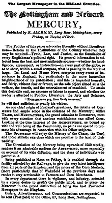 In 1834, Samuel Bennett succeeded Jonathan Dunn as publisher, but he died two years later in 1836[3] and was succeeded by Richard Allen when it changed its name to the Nottingham Mercury. In 1838 its sale was a little over 1,000 per week.