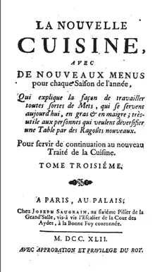 In the 1730s and 1740s, several French writers emphasized their break with tradition, calling their cooking "modern" or "new". Vincent La Chapelle published his Cuisinier moderne in 1733–1735. The first volumes of Menon's Nouveau traité de la cuisine came out in 1739. And it was in 1742 that Menon introduced the term nouvelle cuisine as the title of the third volume of his Nouveau traité.[1] François Marin worked in the same tradition.
