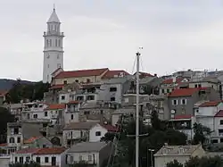 The city of Novi Vinodolski is situated in the northern Croatian Littoral, at Vinodol Riviera of the Adriatic Sea, south of Crikvenica, Selce and Bribir and north of Senj. The population of Novi is 4,005, with a total of 5,113 people in the city administered are.[2] Appearance of Novi Vinodolski is characterized by coastal Mediterranean architecture of white façade houses with red rooftops in the old city's core extending from the coastline up to a church and a tower located on a hill dominating city skyline as if protecting the stone structures uphill. Due to this specific panorama, Novi Vinodolski has been recognized as a tourist city in the past and present.[7] Because of evergreen and deciduous forests and mild Mediterranean climate, as well as clean seawater and air, the city is considered to be a leader in tourist industry of the region, second only to Opatija. City hinterland comprises Vinodol Valley (Vallis vinearia) spanning between Bakarac and Novi Vinodolski.[8]
