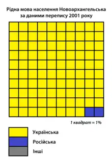 According to the 2001 Ukrainian census, 98% of the inhabitants spoke Ukrainian as a first language and 2% Russian.[3]