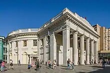 The vestibule is an imposing structure with a grand portico, located on the northeast corner of Novoslobodskaya and Seleznevskaya streets.