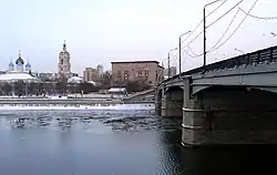 Novospassky Bridge (Russian: Новоспасский Мост) is a steel plate girder bridge that spans Moskva River, connecting Novospassky Monastery and Paveletsky rail terminal areas in Moscow, Russia (about 3 kilometers south-east from the Kremlin). It was built in 1911, as a triple-span steel arch bridge. Reconstruction in 2000 replaced arches with a simpler plate girder structure.[1] Note that the memorial plaque on the bridge spells its name Ново-Спасский, with dash, despite tradition and spelling rules.