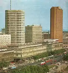 The hotel was built in the 1970s during the period of the so-called People's Republic of Poland controlled by the Soviet Union. Following the modernization policy of the newly incumbent Edward Gierek the state-owned monopoly Orbis Hotels signed at the end of 1971 a contract with the Swedish company Skånska Cementgjuteriet for the construction of a luxurious hotel intended for foreign visitors. The 33 story building in the center of Warsaw, designed by Swedish architect Sten Samuelson at 111 meters was the second tallest building in Poland after the stalinist Palace of Culture and Science. Work was carried out at a record pace, with the hotel opened after just two years as hotel „Forum”, operated by the British company InterContinental.[1] The buildings flat, rectangular shape with several rows of small windows and originally brown color earned it the nickname giant chocolate bar.[2]