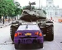At 6 am, Saturday 30 September 2006, Nuamthong drove his taxi, spray painted with the words "[CDR is] destroying the country," and "Sacrificing life", into an M41 Walker Bulldog tank at Bangkok's Royal Plaza. Nuamthong was severely injured and taken to a police station nearby. "I did it intentionally to protest the junta that has destroyed our country, and I painted all the words myself," noted Nuamthong to reporters from his bed at Vachira Hospital.[3][4]