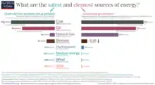 As of February 2020 Our World In Data stated that "nuclear energy and renewables are far, far safer than fossil fuels as regards human health, safety and carbon footprint," with nuclear energy resulting in 99.8% fewer deaths than brown coal; 99.7% fewer than coal; 99.6% fewer than oil; and 97.5% fewer than gas.[26]