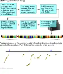 Run on assays have been largely supplanted with Global Run on assays that use next generation DNA sequencing as a readout platform. These assays are known as GRO-Seq and provide an incredibly detailed view of genes engaged in transcription with quantitative levels of expression. Array based methods for analyzing Global run on (GRO) assays are being replaced with Next Generation Sequencing which eliminates the design of probes against gene sequences. Sequencing will catalog all transcripts produced even if they are not reported in databases. GRO-seq involves the labeling of newly synthesized transcripts with bromouridine (BrU). Cells or nuclei are incubated with BrUTP in the presence of sarkosyl, which prevents the attachment of RNA polymerase to the DNA. Therefore only RNA polymerase that are already on the DNA before the addition of sarkosyl will produce new transcripts that will be labeled with BrU. The labeled transcripts are captured with anti-BrU antibody labeled beads, converted to cDNAs and then sequenced by Next Generation DNA sequencing. The sequencing reads are then aligned to the genome and number of reads per transcript provide an accurate estimate of the number of transcripts synthesized.[5]