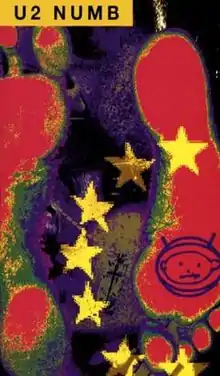 "Numb" is a song by rock band U2. It is the third track from their 1993 album Zooropa and was released in June 1993 as the album's first single. The song features a monotonous mantra of "don't" commands spoken by guitarist the Edge amidst a backdrop of various sound effects and samples. The noisy composition and lyrical concept for "Numb" were inspired by the theme of sensory overload, which had prominently been incorporated into the Zoo TV Tour. Lead singer Bono and drummer Larry Mullen Jr. provided backing vocals on the track.