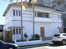 The Nundah Fire Station is a two-storey, symmetrical timber-framed building at the north end of Union Street off Buckland Road and backing onto the railway line. The building is clad with fibrous cement sheeting to the first storey, has timber weatherboards to the lower storey and a terracotta tiled hip roof. On the first floor a central, open verandah balcony projects over the engine room entrance with "Nundah Fire Station" painted in red across the sheeting to the lower part of the balcony. The black painted horizontal cover battens against the white painted sheeting to the first storey give the building a striking street presence.[1]