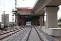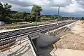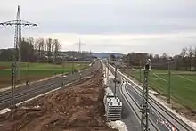 In June 2013, the Dörfles-Esbach connecting curve was connected to the existing network, in order to be able to carry the rails for the construction of the line, among other things.[97] The rails of the new line came from several large German track manufacturers and some were carried by goods trains on the lines from Coburg[98] and Erfurt.[99] At the end of November 2014 Deutsche Bahn announced that all 29 bridges on the new line had been completed.[100]