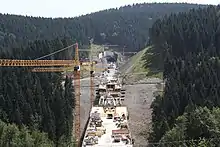 Work on the Müß Tunnel commenced on 29 February 2008.[77] At the beginning of April 2008, Deutsche Bahn called tenders for the construction of the Masserberg, Rehberg, Kulch and Lichtenholz tunnels and the Dunkel, Reh and Mühlbach viaducts in September and November 2008 respectively.[78][79] By the end of 2008, all major civil engineering projects[65] and the construction of all "construction time-determining civil engineering works" would be awarded.[77] At the end of January 2009, the DB advertised tenders for the section from track-kilometre 15.8 to 18.0 (near Coburg) and the first 1.8 kilometre of the Coburg southern connection, each including one tunnel.[80] The invitation to tender for the integration of the line into the Erfurt node followed in July 2009.[81] This was to be carried out in nine stages with train operations continuing and was scheduled to be completed in 2017.[82]