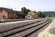 As a result of the shortage of railway materials during the Second World War, the line between Nuremberg-Laufamholz and Hersbruck was reduced to single track in 1943. During the reconstruction of the Nuremberg–Lauf section for the Nuremberg S-Bahn in 1983, the second track was re-installed and electrified. As part of the extension of S-Bahn operations from Lauf to Hartmannshof, the line was blocked to all traffic between Lauf and Hersbruck from 1 August to 14 September 2009.[3] During this period, the second track was restored, installations for overhead wire were built and the upgrading of stations was started.[3] On 14 December 2009, new platforms were opened at Ottensoos, located about 300 metres closer to the centre of the town than the old station.[4] On 15 November 2010, the reconstructed second track was opened between Lauf and Hersbruck.[5]