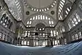 The prayer hall is covered by a single dome 25 metres (82 feet) in diameter and 43.50 meters (142.7 feet) high above the floor level. The mosque utilizes a system of iron bracing running up from the floor, through the walls, and to the ceiling of the dome.[6] The mosque material is made out of cut stone and marble.[4] The general form of the building is described best as "straining everywhere to melt straight lines into curves."[7] The complex has two minarets, each with two balconies. The courtyard of the mosque is designed in the shape of a horseshoe, unprecedented in Ottoman mosques.