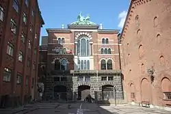 The Ny Carlsberg Brewhouse was built by Carl Jacobsen as the new brewhouse of his Ny Carlsberg Brewery which he had founded after a conflict with his father, Carlsberg-founder J. C. Jacobsen. It was designed by Vilhelm Klein and completed in 1901, replacing a smaller brewhouse still to be seen on the opposite side of the road. The new brewhouse complex also included a straw storage house to the east and a hops store with a yeast cellar to the west.[1]