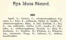 Nya Idun was founded on 7 February 1885 in the premises of the Hushållsskola at Jakobsbergsgatan 11 in Stockholm.[3][4] Its founders were Calla Curman, Hanna Winge, Ellen Fries, Ellen Key and Amelie Wikström.[5][6][7] The first fifteen women elected to the association's committee were Alfhild Agrell, Lilly Engström, Selma Giöbel, Therese Gyldén, Anna Höjer, Amanda Kerfstedt, Anne Charlotte Leffler, Hulda Lundin, Agda Montelius, Anna Munthe-Norstedt, Mathilda Roos, Anna Sandström, Hilma Svedbom, Anna Whitlock, and Coraly Zethræus.[8]