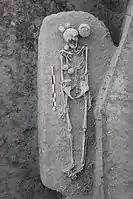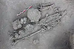 Grave goods were found with many of the burials and were contained a wide variety of pots, ranging from a diameter of 4 cm to 55 cm, and held a multitude of items.[2] Items that were collected at this site include bronze tools, both animal and human bones, pottery and stone tools.[2] These items were collected from four excavation pits (SE,M,NW,NE), and pit SE was where almost exclusively where bronze tools were located.[1] A majority of the bronze artifacts were either axes or spear points, and no jewelry made of bronze.[2]