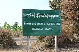Nyaung-gan is a Bronze Age cemetery in central Myanmar, and was the first site in Myanmar to have artefacts dating to the Bronze Age.[1] Burials found over two seasons (1998–1999) were found to have grave goods consisting of pottery filled with animal bones, beads, spear points, terracotta and jewelry,[2] no iron was found at the site[1] and that provides a good benchmark to start with dating of the site. The site was initially thought to be a significant site due to surface findings, so a team was assembled to investigate the validity of that claim.[2] Myanmar is centrally located along trade routes that connect South, East, and Southeast Asia,[3] and has great potential to show cultural influence from all stops along those trade routes. Another unique aspect of the site is that the skeletons found in the burials were left in situ, and a museum was constructed around them.[2]