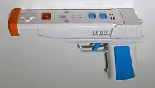 The Pistol Grip is a gun shell for Wands, similar in design to Nyko's (mechanical) Perfect Shot, with digital inputs using Trans-Port.[14] It is intended for use with light gun games, and features digital hammer and trigger buttons mapped to the Wand's A and B buttons, with a switch allowing their functions to be inverted depending on the game's controls. It also includes a rumble motor for haptic feedback, and a pass-through port for attaching other accessories to the Pistol Grip. Due to its reliance on features of the Wand, it is not compatible with other devices.[15]