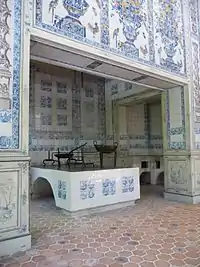 Around 1770 the original furnishing of the Salettl was replaced by Rococo-style furniture, which with its blue and white framing picks up on the colors of the wall design and can still be seen in the Pagodenburg. This includes a round extendable table with the Wittelsbacher coat of arms on top, two canapes and a chandelier.[39]