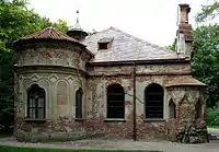 The rectangular Crown Prince’s Garden (Ludwigsgarten) is located northeast of the Amalienburg. It was the first work of Friedrich Ludwig Sckell in Nymphenburg. He created this moderate garden, which already had some characteristics of the English garden style for the young Ludwig I in 1799. The pavilion, a two-storey wooden structure, was also built for him. Its octagonal main part has two rooms on two floors with the same layout. In the portico, which is popularly called the Witch's house, a staircase leads to the first floor. Its exterior painting is intended to give the impression of an artificial ruin. The walls inside are decorated with hand-printed wallpaper. A small brook emerges from between stones as if from a natural rock spring. It is fed from the water of the southern canal via a gradient water pipe. The garden is separated from the rest of the Amalienburg garden by a wooden fence. The Crown Prince's Garden was restored in 1982/83.