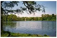 The largest area of the park is occupied by the English-style landscape garden. The northern part is defined by panoramic vistas of the Pagodenburg Lake with the Pagodenburg and the Pagodenburg valley, A meadow valley is running to the north with a brook, that flows into the Kugelweiher pond. The southern part is even more diverse with a panoramic vista of the large Badenburg Lake, It allows visitors views of the water surface at the Apollo temple (built in the form of a monopteros) and the Badenburg, behind which a wide meadow valley, called the Löwental (Lion Valley) leads to the south, as well as to a hamlet, the Amalienburg and the Crown Prince Garden south of the Great Parterre.[9][28]