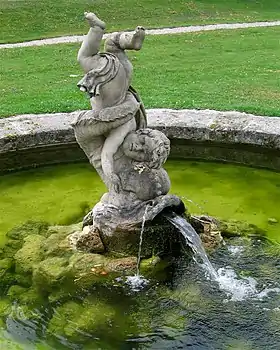 The garden-side fountain had its predecessor in the Flora-fountain, which dominated the Baroque garden parterre. It was built from 1717 to 1722. Its large, octagonal marble basin was adorned with numerous figures made of gold-plated lead by the Flemish sculptor Guillielmus de Grof. In addition to the large statue of Flora, putti and animal figures once existed, some of which were arranged in teasing positions. The fountain was demolished at the beginning of the 19th century due to the simplification of the Garden parterre by Ludwig von Sckell, its remains have since disappeared. Today's fountain is operated by a pressure line from the Green Pump House in the village.[33][32]