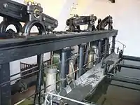 The city-side fountain receives its water from the pressure pumps in the St John’s Pumping Tower (Johannis-Brunnturm) of the palace building, which are driven by three colossal water wheels. On elector Maximilian I Josephs order in 1802 Joseph von Baader redesigned and in 1807 eventually replaced the pump that had been built by Franz Ferdinand Albert Graf von Wahl in 1716. The facility largely retains its original condition.[31][32]