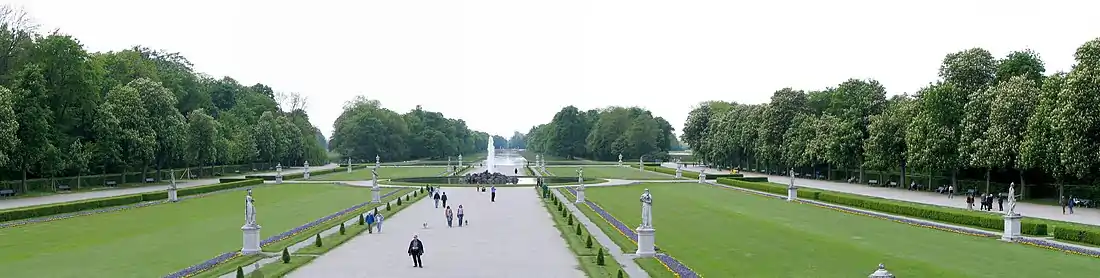 Sckell's ploys made Nymphenburg Palace Park a prime example of the synthesis of two fundamentally different garden types. The orderly French Baroque garden, which maintains the idea to enhance nature through the means of art and order flanked by the English landscape park, that highlights the free play of nature. Some areas of the park were first opened to the public in 1792 under Elector Charles Theodore.[8][9]