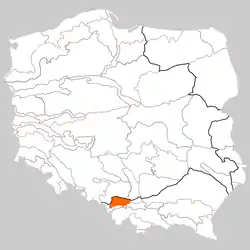 Oświęcim Basin (Polish: Kotlina Oświęcimska[1]) is a lowland, located in southern Poland, between the Lesser Poland Highlands to the north, Silesian Foothills and Wieliczka Foothills to the south. It has the size of around 1,236 km2 (477 sq mi). Its name comes from the city of Oświęcim. It is located on the Vistula River on the confluences of Biała, Soła and Skawa which begin in Carpathian Mountains and Przemsza which begins in Silesian Highlands.