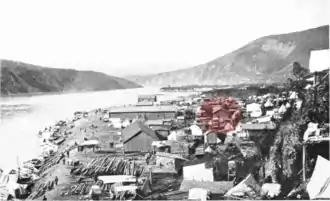 Dawson City was founded in 1896 in the early days of the Klondike Gold Rush, alongside the Yukon River in north-western Canada.[1] Swelled by would-be gold-miners and adventurers, Dawson's population soared to 30,000 at the height of the rush in 1898.[2] Dawson declined in size again as many of the immigrants left, but it was appointed the Territorial Capital of the new Yukon Territory in 1900, and by the following year it had a stable population of around 10,000.[3]