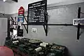 O'Hara's Battery features a narrow stairway (pictured below) which leads to the door of an underground magazine. A concrete enclosure contains a portion of the shell hoist and surrounds the gun turntable, which provides support to the 9.2 inch gun and rotates it as needed. Large black steel doors in the enclosure provide access to the turntable. A path (pictured below) which leads down from O'Hara's Battery turns up to the nearby Lord Airey's Battery. That pathway features an extra gun barrel (pictured below).[17] The tunnel (pictured below) between the engine room and the gun not only provides access, but also stores pumps, hoists, and shells.[23]