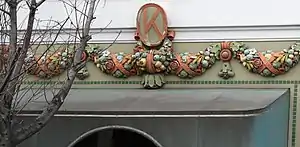 The building's main entrance leads to the second floor offices. The entrance is the buildings most decorative architectural feature. The wooden doorframes are hand carved. There is a stained glass transom above the entrance with a “Bend Bee” design in the middle. The Bend Bee design is set in blue with a white border. Above the entrance on the outside, there is a plaster cornucopia garland of flowers, fruits, and wheat stocks.[1]