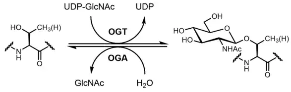 Due to the dynamic nature of O-GlcNAc and its presence on serine and threonine residues, O-GlcNAcylation is similar to protein phosphorylation in some respects. While there are roughly 500 kinases and 150 phosphatases that regulate protein phosphorylation in humans, there are only 2 enzymes that regulate the cycling of O-GlcNAc: O-GlcNAc transferase (OGT) and O-GlcNAcase (OGA) catalyze the addition and removal of O-GlcNAc, respectively.[2] OGT utilizes UDP-GlcNAc as the donor sugar for sugar transfer.[3]
