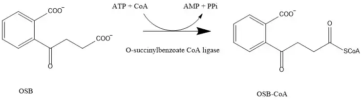 O-succinylbenzoate CoA ligase (EC 6.2.1.26), encoded from the menE gene in Escherichia coli, catalyzes the fifth reaction in the synthesis of menaquinone (vitamin K2). This pathway is called 1, 4-dihydroxy-2-naphthoate biosynthesis I.[1] Vitamin K is a quinone that serves as an electron transporter during anaerobic respiration. This process of anaerobic respiration allows the bacteria to generate the energy required to survive.