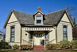 The O. E. Payne House, also known as Dual Gables, is a historic building located in Chariton, Iowa, United States. The single-story frame house was built in 1889. Its significance is derived from its unusual architectural form that originated in the picturesque architectural tradition of the mid-19th century.[2] It follows a Y-shaped plan with two front gables that are set at right angles from each other, and they each sit at a 45° angle to the street. Within the angle is located two entrances, above which is a wooden frieze that features quatrefoil cutouts. On the gable ends the clapboards are set in a diagonal pattern above a frieze of recessed square panels. The stem of the Y extends to the rear of the property. The house was listed on the National Register of Historic Places in 1979.[1]
