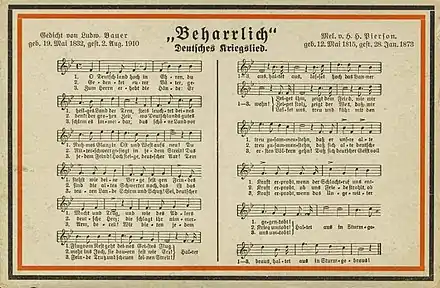 In 1858, Henry Hugh Pierson, an English composer resident in Germany, had written a tune for the patriotic song Ye mariners of England by Thomas Campbell.[1] One year later, he met Ludwig Bauer, who later married Pierson's stepdaughter Dorothea Lyser. Pierson asked Bauer to write a German text to the existing tune.[2]
