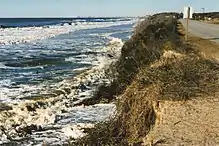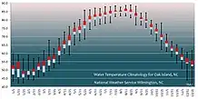 Summers on Oak Island are hot and humid with an average temperature of 85˚, although the beach front is cooled much of the time by sea breezes (the prevailing winds are from the southwest). Ocean water temperatures range from the 50s to the mid 80s. Winters are moderate with an average temperature in the 50s (°F), albeit with brief cold periods. Rain occurs throughout the year with average annual rainfall approximately 57", 45% of this falling between June and September.[20] Tropical storms are a continuing source of concern, e.g., in the 1996-1999 period, four major hurricanes (Bertha, Fran, Bonnie, and Floyd) made landfall and had significant effects on the area.[21] More recently, in October 2016, the eye of Hurricane Matthew passed almost directly over the island inflicting significant damage to the dune system,[22] and in September 2018, Hurricane Florence caused severe flooding and wind damage in addition to washing away most of the beach sand added earlier in the year.[23]