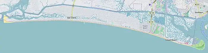 Beach erosion has been a continuing problem for the island, with the first major success in restoration, the 2001 sand deposition on the east end of the island using material dredged from the Wilmington Harbor Channel.[12] Since then, two similar projects have been completed along with other, smaller efforts, e.g two Sea Turtle Habitat Restoration Projects.[13] Concern about the beach has also occasioned the creation of Beach Preservation Trust funds by both the Towns of Oak island and Caswell Beach and the formation of active citizen groups supporting the Natural Resources Defense Council "Protect our Coast" effort.[14] One such group, familiarly known as the Oak Island Crabbies,[15] is currently heading the Brunswick County effort opposing seismic testing and off shore drilling as proposed the Bureau of Ocean Energy Management (BOEM).[16]