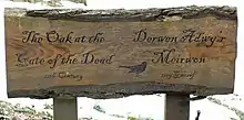 The oak is estimated to be more than 1,000 years old and it has been associated with the reign of King Ecgberht of Wessex (802–839).[3] If the estimated age is correct, the oak was standing in 1165 when the Battle of Crogen was fought at the location and has therefore been described as the "only living witness to this battle".[1][2] A Welsh army under Owain Gwynedd inflicted a defeat upon the English king Henry II and forced him to retreat.[1][4] The battle's dead were said to have been buried in the ditch of the dyke at that point: in the 19th century this was known as Adwy'r Beddau, the pass, or gap, of the graves, with some of the graves still being visible as late as 1697 according to one account.[5][6] Two or three parcels of land on either side of the dyke were also known as Tir y Beddau, land of the graves,[5] although one early 19th century account suggested that the place was also known as Adwy'r Bedwen, the gap of the birch tree.[7] The tree has in recent years been promoted as a symbol of the Battle of Crogen, under the name "Oak at the Gate of the Dead", and in March 2009 a plaque was unveiled honouring this link.[2] In cold weather in February 2010 the tree split into two and was subsequently afforded the protection of a tree preservation order by Wrexham County Borough Council.[2][3]