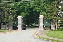 The cemetery entrance is marked by a set of monumental gates, designed in the Art Nouveau style by Davenport architect Edward Hammatt in 1895. Construction of the gates was completed in 1896.[11]