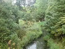 The least modified regions, with mostly natural channels and significant riparian vegetation, exists between approximately Blockhouse Bay Road and the inlet at the northern edge of Waterview.[1] A walkway runs along a good part of the creek in the section northwest of Mt Albert.[3] This area of the creek is also significant for a relatively large number of archeologically significant sites, due to the use of the creek by Maori reaching inland from the inlet (landing sites and settlement remnants), and due to the later lack of strong European settlement along this part of the area.[1]