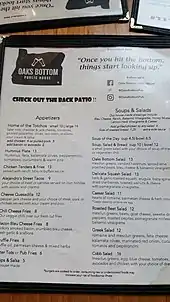 Oaks Bottom Public House is a restaurant on Bybee Boulevard in the Westmoreland district of southeast Portland's Sellwood-Moreland neighborhood.[1] Alex Frane of Eater Portland has described Oaks Bottom as a "family-friendly, wood-lined" restaurant,[2] which is named after the Oaks Bottom Wildlife Refuge, a nearby natural wetlands.[3] The menu includes "totchos" (tater tots as nachos); toppings include cheddar and jack cheese, jalapeños, olives, red onions, salsa, scallions, sour cream, and tomatoes, with avocado, chicken, and pulled pork as additional options.[4]