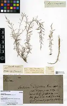 Obelia dichotoma[1] is a broadly distributed, mainly marine but sometimes freshwater, colonial hydrozoan in the order Leptothecata that forms regular branching stems and a distinctive hydrotheca. O. dichotoma can be found in climates from the arctic to the tropics in protected waters such as marches and creeks but not near open coasts like beaches in depths up to 250m.[1][2] O. dichotoma uses asexual and sexual reproduction and feeds on mainly zooplankton and fecal pellets.[2] Obelia dichotoma has a complex relationship with the ecosystem and many economic systems.[3][4]