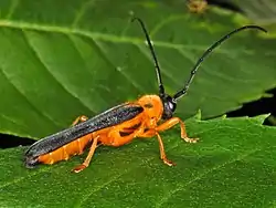 Oberea pupillata measures between 13 to 18 mm (0.51 to 0.71 in).[4] These beetles have a long and slender body. Head, thorax and abdomen have all about same width, and elytra are not tapered. Head and antennae are black and antennae are shorter than body. Pronotum is orange with two elongated black spots on the sides. The elytra are mostly blackish, yellowish at the base and rather hairy. The body is orange, with black markings on the sides and below the abdomen. The last abdominal segment shows a black mark. The legs are orange.