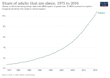 According to WHO, overweight and obesity levels in Thailand have been steadily increasing over the years. The percentage of overweight or obese adults increased from 8.6% in 1975 to 32.6% in 2016.[11]