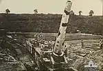 The first use of the mle 1915/1916 was during the Battle of Verdun. Two mle 1915/1916's (those of the 77th Battery of the 3rd Foot Artillery Regiment) were deployed 13 km (8.1 mi) to the south-west at Baleycourt to participate in the preparation for the French counteroffensive on October 21, 1916. It is estimated that 373 rounds of 370 mm and 400 mm were fired during this battle.[9] Fort Douaumont was the first to be hit and then Fort Vaux. On October 23, 1916, of the fifty or so shells striking the fort, six pierced the concrete, earth, and masonry defensive works. The first exploded in the infirmary, another in the hallway, three others smashed a casemate attached to the barracks and lastly, a munitions depot was hit, triggering a fire. Explosions and toxic gases forced the German garrison to evacuate the fort, allowing the French to reoccupy it the next day.[10]