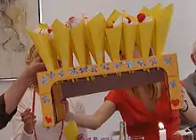 The Danish lejlighedssang remains a strong tradition,[2] part of family celebrations, particularly during confirmation, wedding and anniversary parties. Participants write lyrics for the specific occasion composed upon a popular tune. Copies of the lyrics are written on decorative pages and distributed among the celebrants to be read and sung en masse. The tradition in Denmark dates back to the street ballads and political club songs of the late 1700s.[3] Group singing became further integrated across Danish society by the influence of N. F. S. Grundtvig's national consciousness and public school movements in the mid-1800s.[3] By post-World War II, the singing of lejlighedssange at celebrations was typical.[3] According to Danish historians, the lejlighedssang persists in modern Danish culture as an important form of group bonding or fælleskab (togetherness).[2][3]
