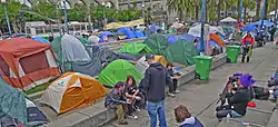 On October 15, 2011, thousands participated in a march from Justin Herman Plaza to the San Francisco City Hall.[17] Dubbed the "Global Day of Action,"[18] #15october,[19] "Occupy Earth,"[20] and now known as the 15 October 2011 global protests, it was a broad coordination of people-to-people diplomacy between online activists around the world, including many from Occupy San Francisco.[21]