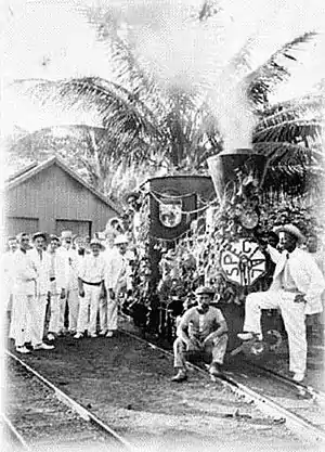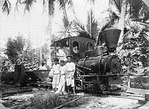 Later diesel locomotives were used. Passenger transport was done with a canopee car for the Europeans and an open wagon for the native labourers.[3]