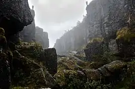 The Peña de Otí (English: "Rock of Otí") is an outcrop of alternating shales and sandstones of the Socha Formation.[18] It is observed to the southwest from the main trail leading to the Mirador de los Cóndores on the páramo. The rocks of the Peña de Otí were used to construct the churches and convent in Monguí. Legends about the Peña include tales of witches dancing with the devil on October 31, the origin of the scratches on the rock face from the devil who was riding a donkey on the hilltop and fell down, when the hoofs created the scratches and that the hill opened one day revealing the Calicanto Bridge and church made of gold. The end of the world would come when the hill closed again.[35]