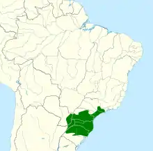 The ochre-collared piculet is native to South America, its range extending from southeastern Brazil and eastern Paraguay to northeastern Argentina. It is a resident and sedentary species found at altitudes of up to 800 m (2,600 ft). Its habitat is mostly lowland rainforest with bamboos, vines and tangled growth, but it is also found in secondary growth, thickets, tall scrub, parks and gardens.[2] It hybridizes with the white-barred piculet where their ranges overlap.[3]